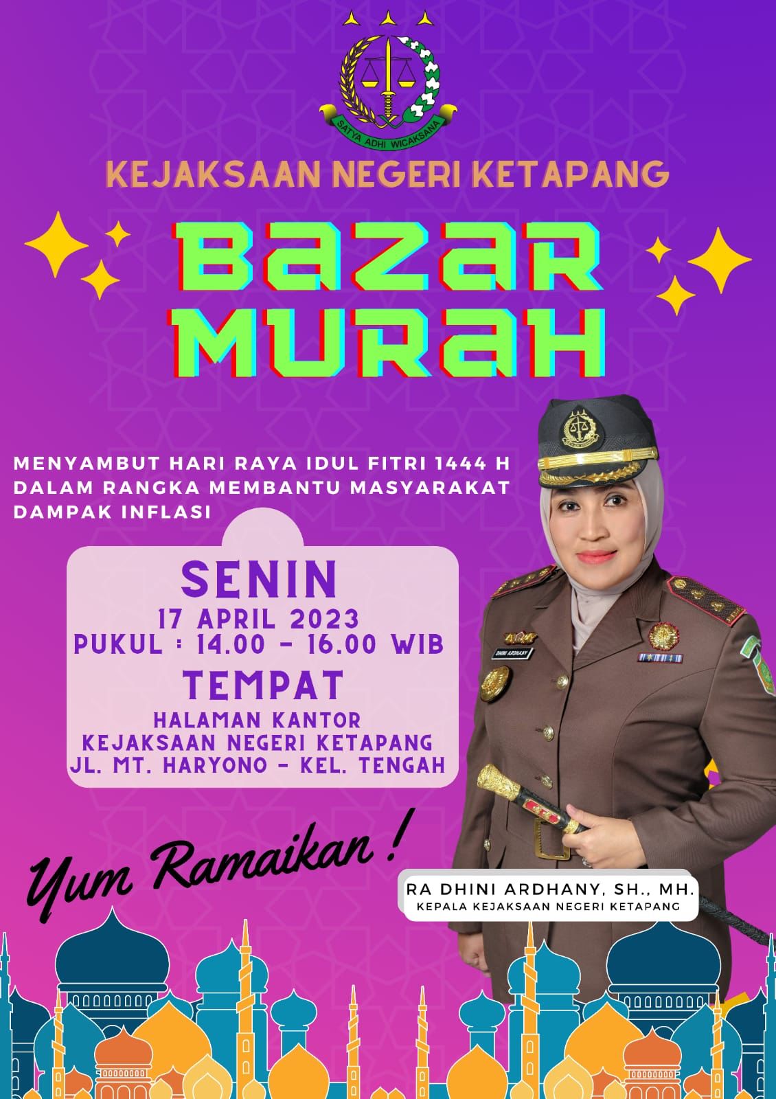 HARIANTRIBUANA.CO, Ketapang – Kejaksaan Negeri (Kejari) Ketapang akan menggelar bazar murah dalam rangka membantu masyarakat dari dampak inflasi menyambut Hari Raya Idul Fitri 1444 H. Kegiatan yang dipusatkan di halaman kantor Kejari Ketapang berlangsung pada Senin (17/4/2023) Pukul 14.00 sampai 16.00 WIB.